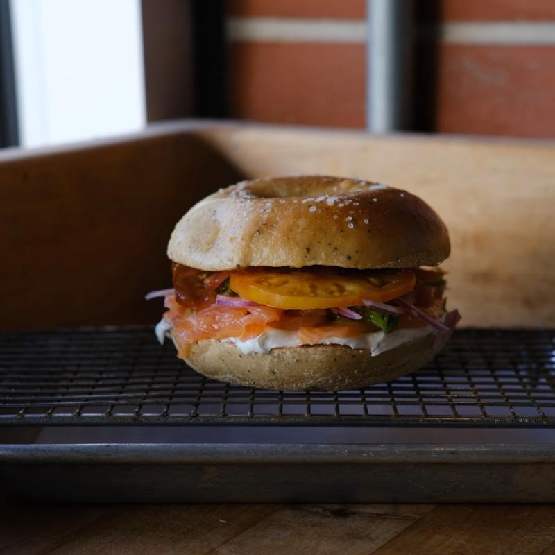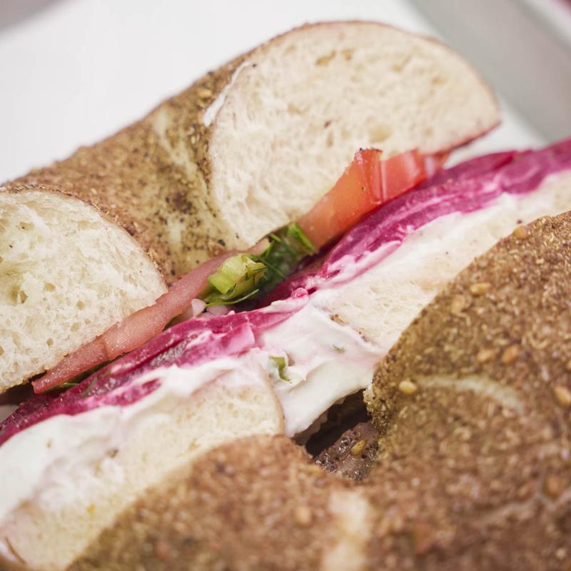 Like a hoagie but on a bagel! Coppa, calabrese, fresh mozzarella, shredded lettuce, red onion, heirloom tomato, lemon vin, garlic aioli, mom's tapenade.